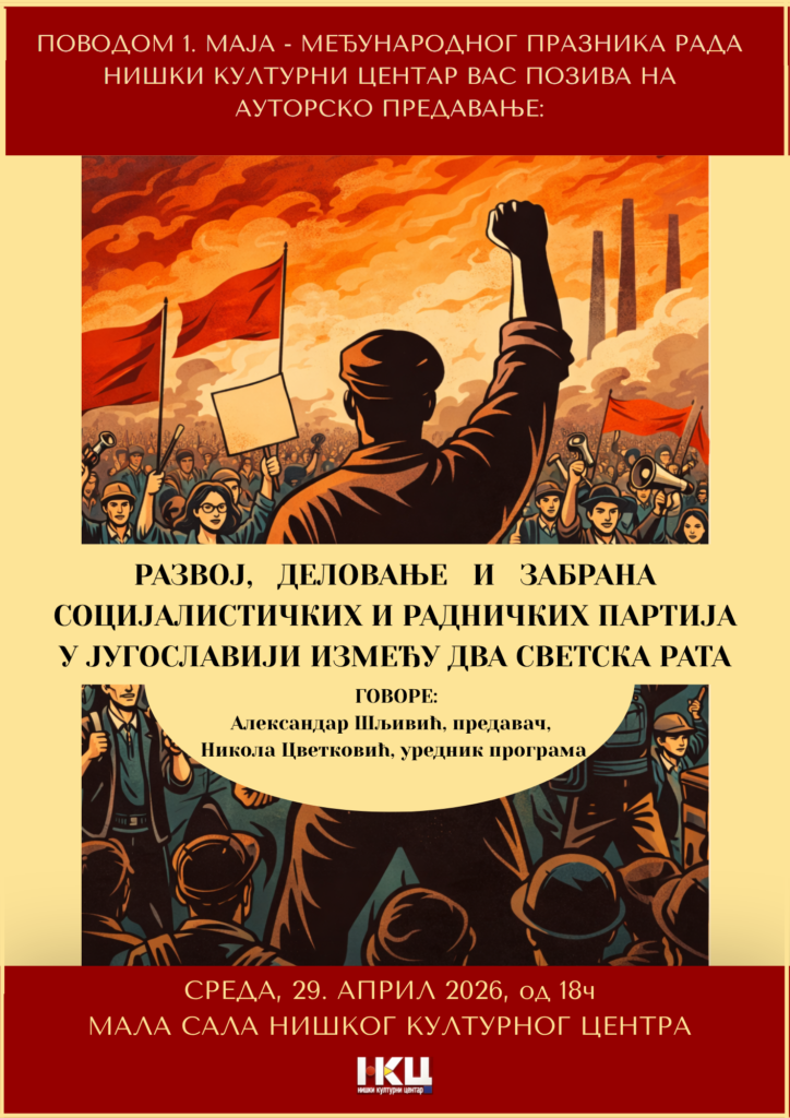 Povodom obeležavanja Prvog maja – Međunarodnog praznika rada, Niški kulturni centar (NKC) pripremio je poseban program za sve ljubitelje istorije, sociologije i političke teorije. U duhu tradicije koja slavi prava radnika i borbu za socijalnu pravdu, u sredu, 29. aprila 2026. godine, sa početkom u 18 sati, u Maloj sali NKC-a biće održano stručno autorsko predavanje koje osvetljava jedan od najdinamičnijih perioda naše prošlosti.