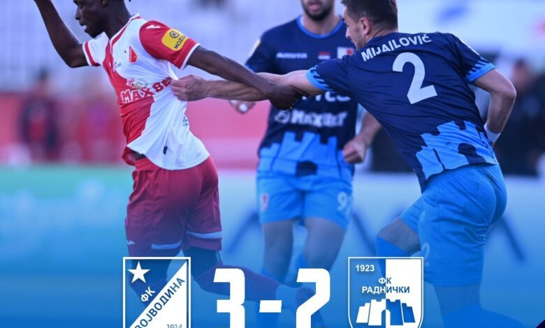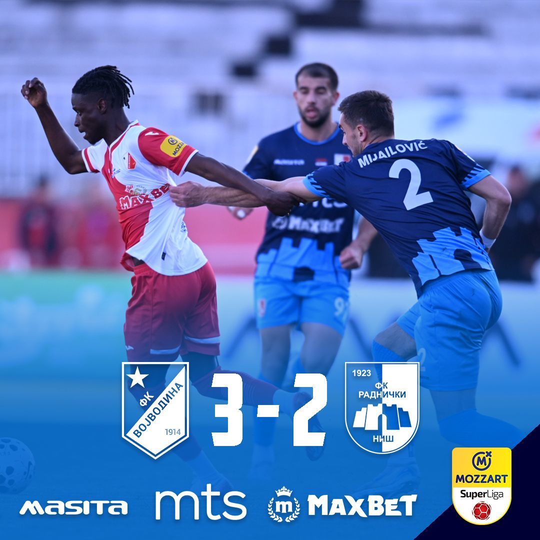 Fudbaleri Radničkog poraženi su od ekipe Vojvodine u 30. kolu Superlige Srbije sa 3:2 (1:0). Domaći tim poveo je u 24. minutu preko Marka Veličkovića i to je jedini pogodak koji je viđen u prvom delu meča.