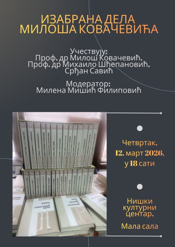 Niški kulturni centar organizuje predstavljanje edicije “Izabrana dela Miloša Kovačevića” u četvrtak, 12. marta 2026. godine u Maloj sali NKC-a, u 18 sati.