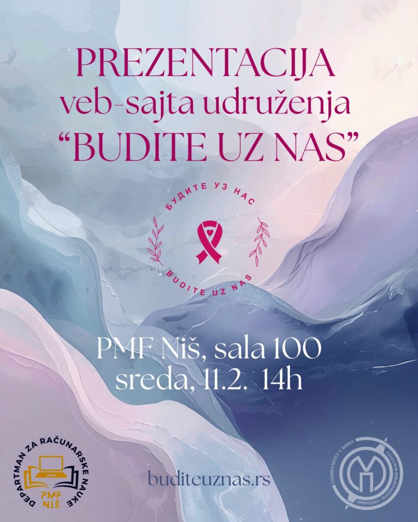 Prezentacija veb-sajta Udruženja žena obolelih od raka “Budite uz nas”, koji su izradili studenti sa Departmana za računarske nauke, biće organizovana u sredu, 11. februara 2026. godine od 14 sati u sali 100 Prirodno-matematičkog fakulteta u Nišu.