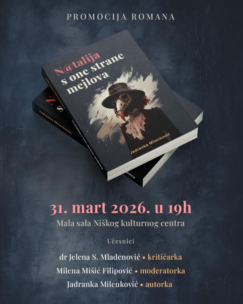 Niški kulturni centar organizuje razgovor o romanu „Natalija s one strane mejlova”, autorke Jadranke Milenković, u utorak, 31. marta 2026, u 19 sati u maloj sali NKC-a.