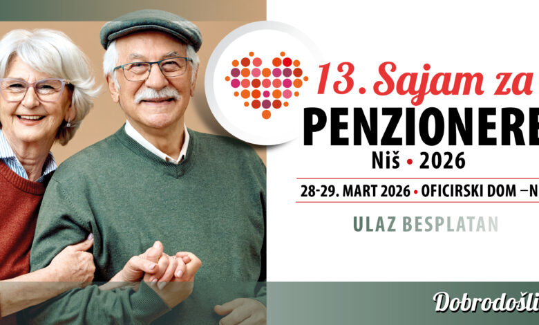 Trinaesti Sajam za penzionere pod sloganom „Za bezbrižnu starost“ biće održan 28. i 29. marta u Oficirskom domu u Nišu. Ulaz je besplatan, a radno vreme od 10 do 17 časova. Tokom dvodnevne manifestacije, posetioce očekuju izložbeni program, savetovanja, radionice, nagradne igre, kao i kulturno-umetnički i muzički sadržaji.